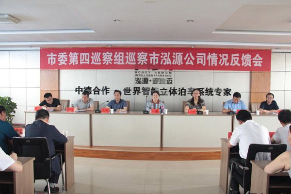 2019-07-19?2019年7月18日上午,市委第四巡察組巡察平涼泓源公司反饋會在甘肅泓源麥迪邁智能立體停車有限責任公司3樓會議室召開。市委巡察辦主任趙玖梅,市紀委常委、市監(jiān)委委員、正縣級紀檢監(jiān)察員宋紅妍,市紀委監(jiān)委派駐市農牧局紀檢監(jiān)察組組長劉剛出席會議并